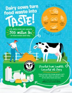 To best feed people, locally and worldwide, dairy farmers provide their cows with a highly nutritious feed, often utilizing food byproducts and waste. About 80% of a cow’s diet is made up of food humans can’t eat, like citrus peals, almond husks, cottonseed, and brewer’s grains. One cow eats up to 48 pounds of upcycled food waste a day; U.S. dairy cows consume 204-306 million pounds of byproducts and food waste each day.